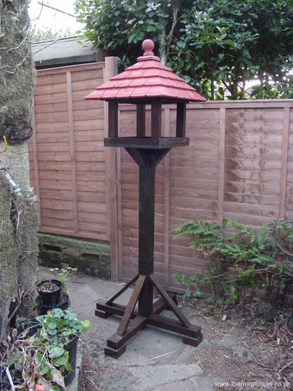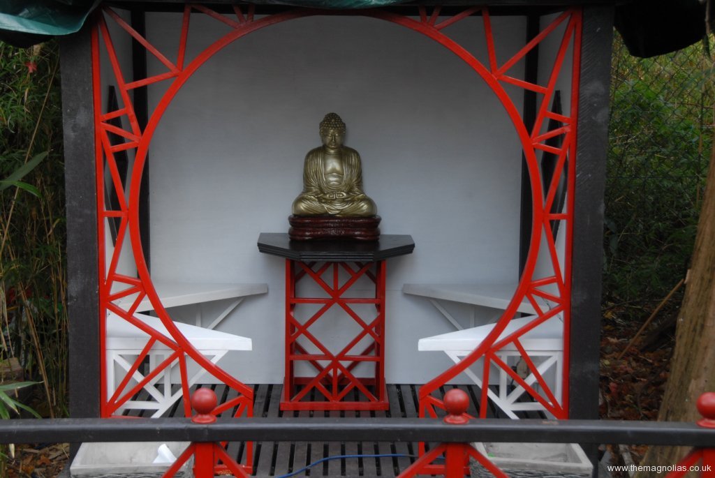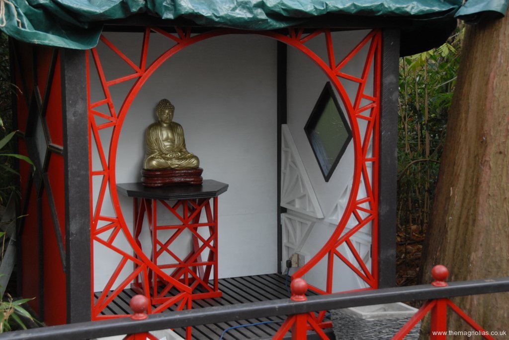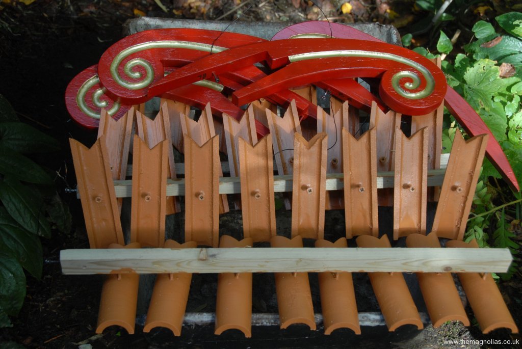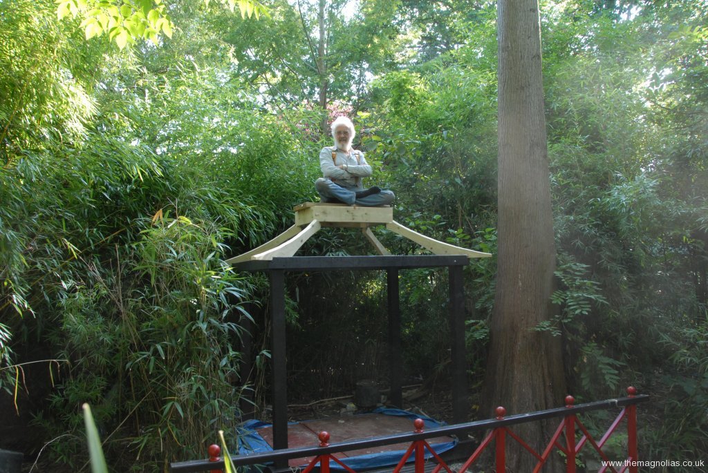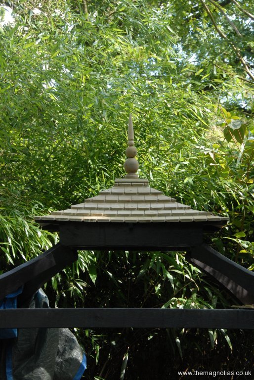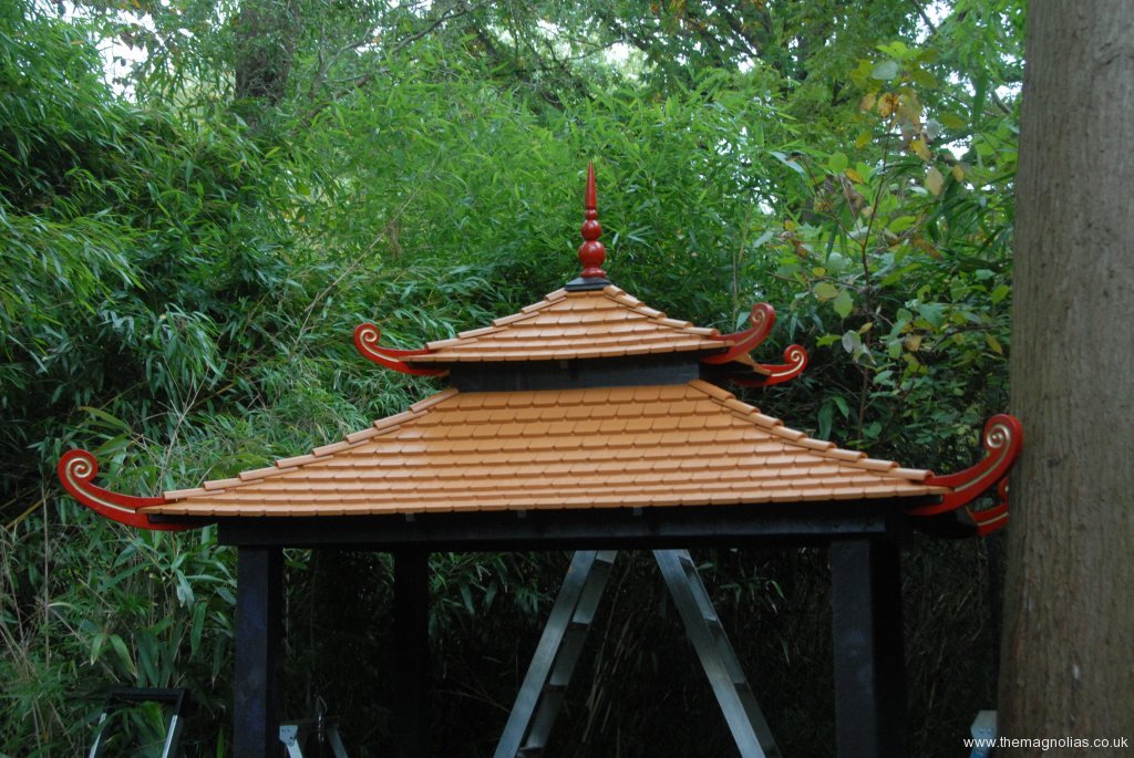 We looked on the internet at oriental, Chinese and Japanese pagodas to see what the colour of roofs should be. It appears that almost any colour including red and green were out there. I wanted it to be gold even metallic gold. In the end we bought Protek gold Wood Stain and Protector to try. It turned out to look good especially with the sun shining on it. I still hankered for over painting it with metallic gold but was overruled by the majority, Paul, Linda and others.