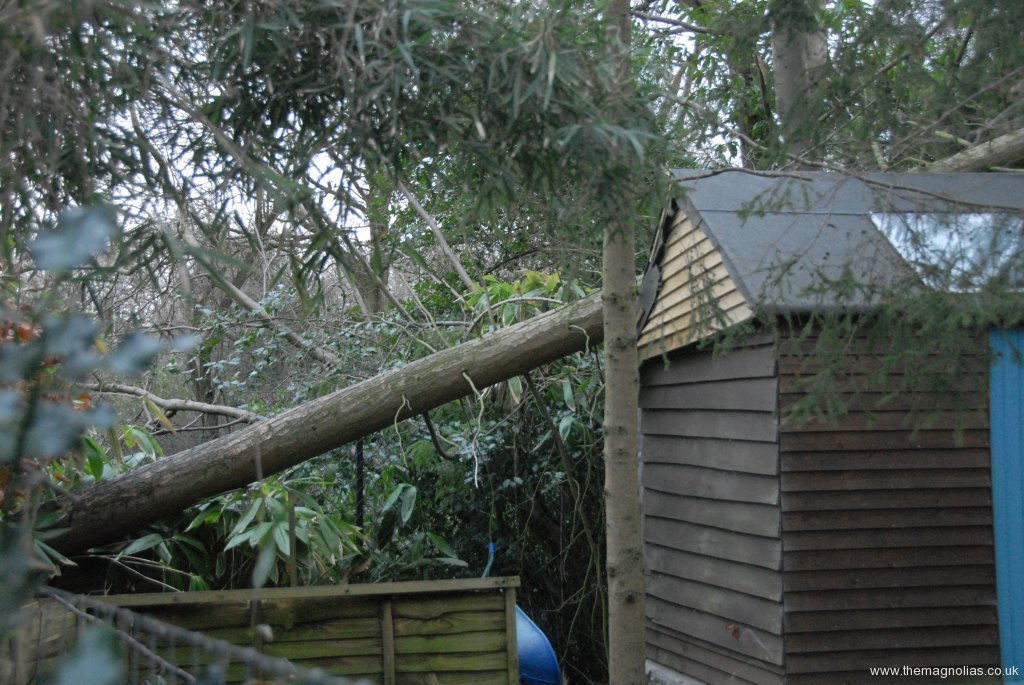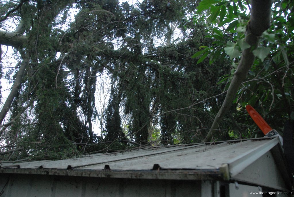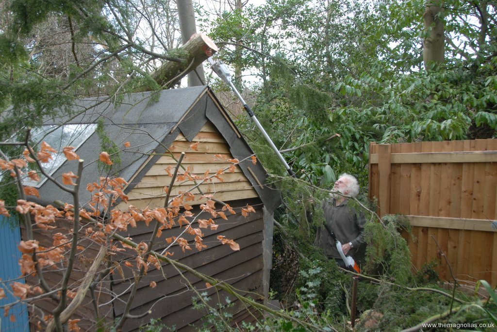 In both gardens it lay across garden sheds without doing significant damage. Linda and I with some help from our neighbours managed to get it down from over the sheds without any further damage and to cut it up into portable, split-able lengths in one day.