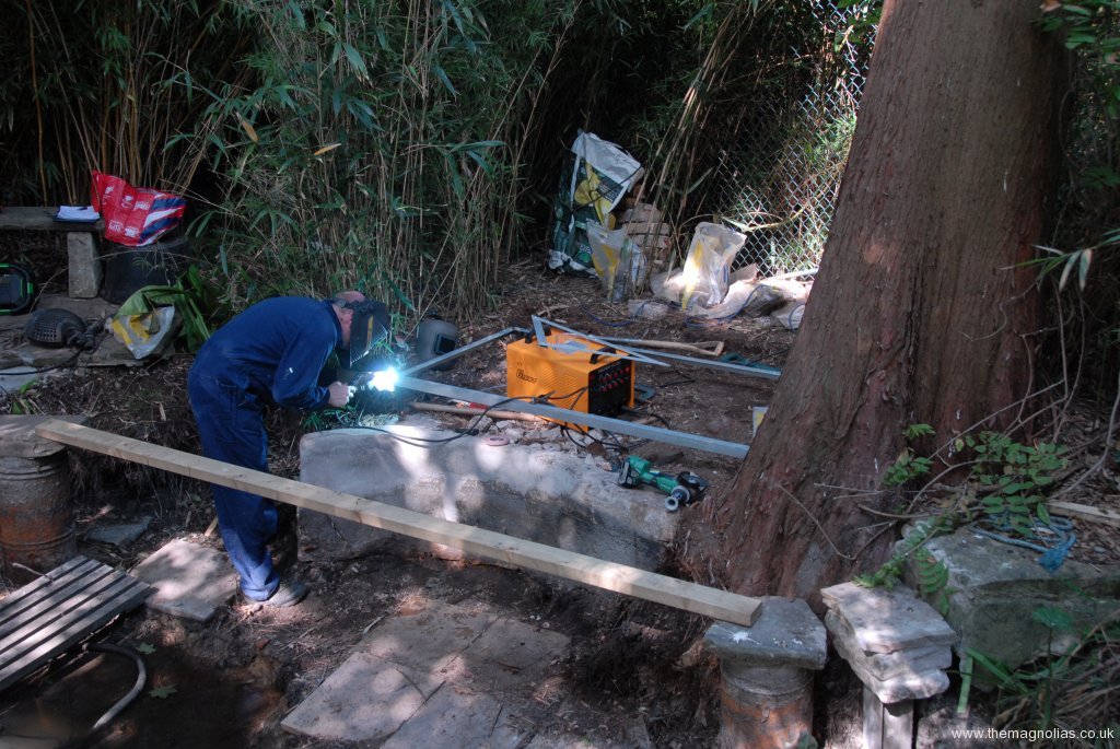 We were able to use the four original steel anchor points from the old pagoda for fixing the new pagoda frame. Due to the close proximity of our sizeable Taxodium distichum (Swamp Cypress), we could not make the pagoda square as was the old one. We innocently went with a rectangular shape not realizing this was to make life much harder when constructing the roof.