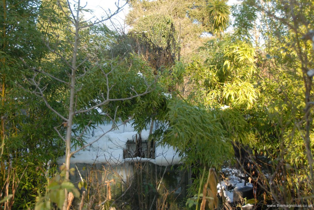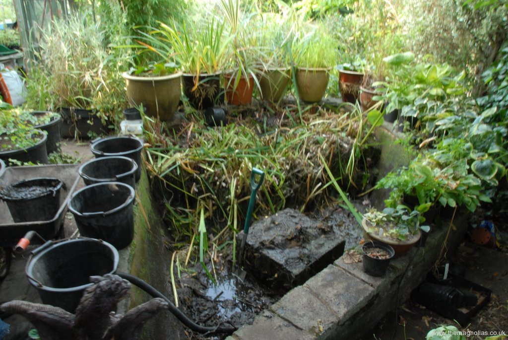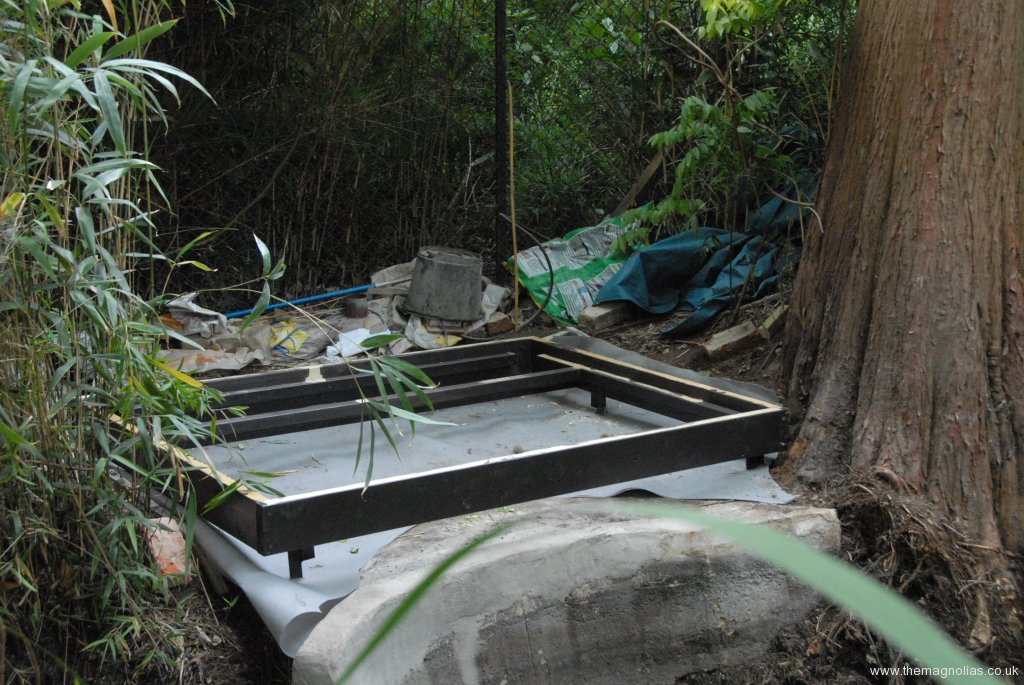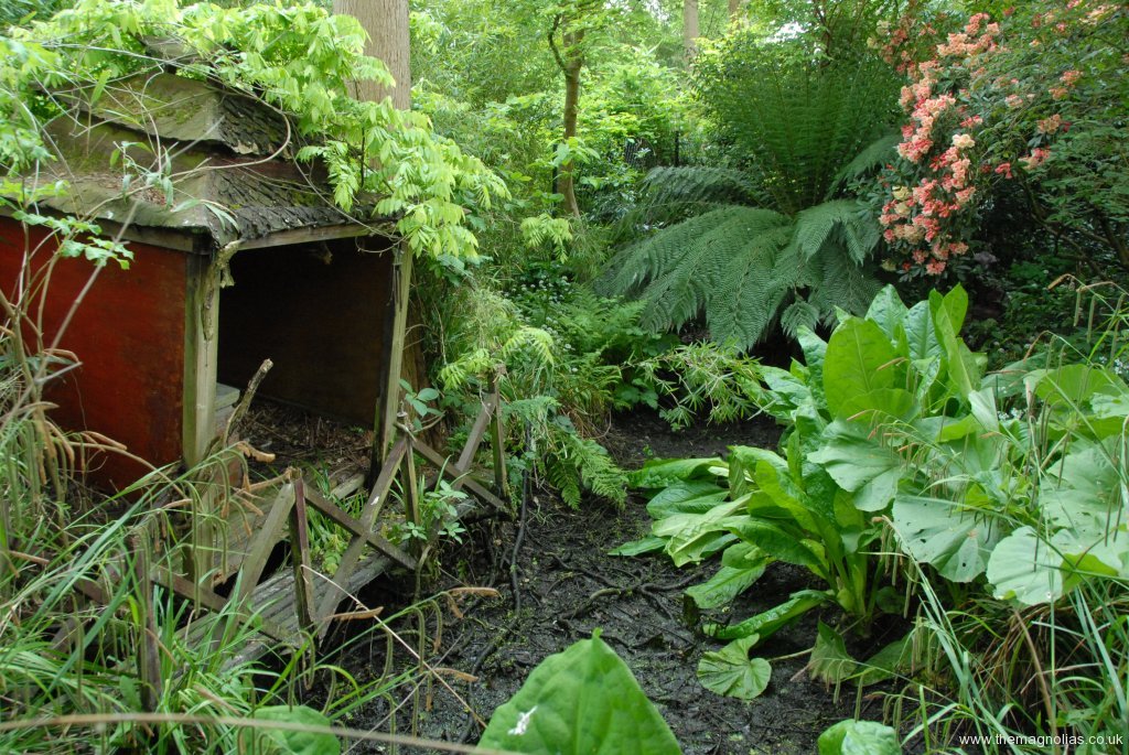 At last spring’s Epimedium Open Weekend we discussed its demolition and replacement with several groups of visitors. To our surprise quite a few people said this would be a shame as it had a lovely “lost Garden of Heligan” look. However it was beginning to lean perilously to the point it was clear it would fall into the pond before too long.