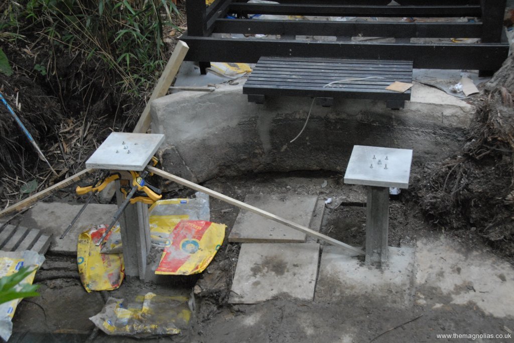 I had come up with a successful pillar construction method Paul and I had used for the new stepping stone.This was using two cut lengths of slotted concrete fence posts temporarily wired together, concreted into a large hole in the bottom of the pond and then filled with a cement and sharp sand mortar, down the centre hole. Two more pillars were created for the walkway.