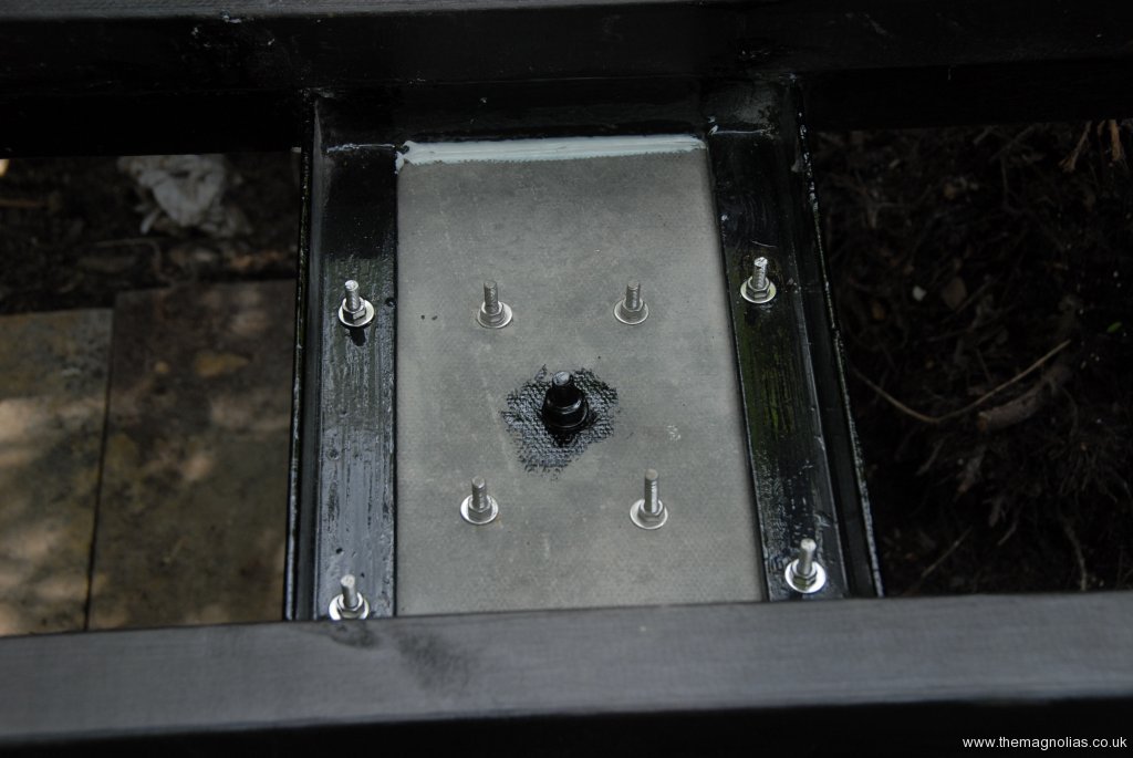 This time large galvanised coach bolt was put in the centre of the top of each pillar, sticking out a couple of inches as a fixing point. When all the concrete had gone off, I drilled four holes near the outer corners of each pillar and used a miraculous cement epoxy fixing mastic to secure lengths of 6mm stainless steel studding. I had never used this technique before and was amazed how quick it went off, and only just managed to start the second pillar before the two part mastic went off in the nozzle. I cut pieces of thin paving slabs to go on top of the pillars and drilled five holes through them to line up with the coach screws and studding. Using nuts and washers above and below the slabs I was able to adjust the slabs up and down like a surveyors’ theodolite until they were flat and level with each other and at the correct height to receive the walkway steel frame and wooden decking later. The next job was to drill further holes through the slabs and the steel frame for bolting the frame in place. When I was happy they were level, I worked a strong concrete mortar on top of the pillar and under the slab for stability. Later I cast a cement mortar layer over the coach bolt and studding to finish off the tops of the pillars neatly.