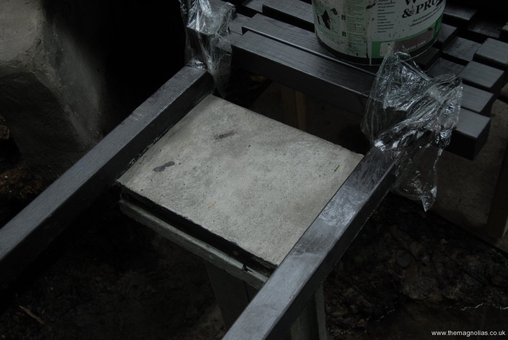 I subsequently ordered more and some are still to come. These were glued into 10mm holes drilled with a forstner bit into the seats supports etc to held the seats and legs in the up and down / open and shut positions. They work very well being amazingly strong.The last additions to the construction have been a pair of slate covered concrete square planters and two ornamental warning bollards on the corners of the step.