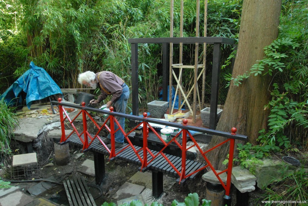 Before proceeding with demolition of the old pagoda itself we decided to repair the York-stone crazy paving at the far end of the pond. A pointed piece of a square yard or so had drooped over the years so the tip of it was under water. We had approached our ‘friendly builders’ about the problem but they couldn’t see my plan for jacking up the whole piece, possible. Paul and I tackled it one weekend when Linda was away at her mum’s. We used the Metasequoia glyptostroboides (Dawn Redwood) trunk and an aluminium ladder as a crane with ropes and a hand winch to pull the paving up by some six inches. I had remembered that this piece of paving had been reinforced with stainless steel rods, so was reasonably confident it would not break up. It was remarkably successful and with a little trepidation we concreted in a cut down concrete post, in under it, to keep it level with the nearest stepping stone as it had been originally. A few other areas of paving lifted by the Metasequoia’s roots also needed work. Also that weekend, Paul and I concreted in a new third stepping stone, which we thought a good idea as there was rather a big gap between the bank and one of the original ones.