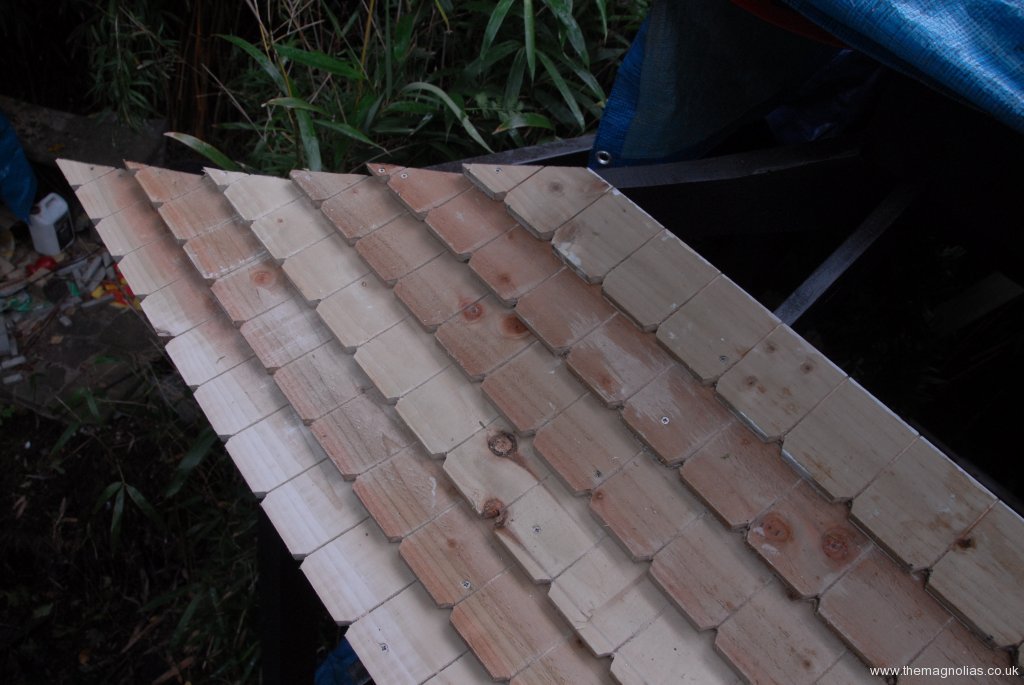 We had discussed finials for the corners of both roofs, Paul even suggesting dragons. However for relative ease of making, I quickly drew a simple scroll finial, which did look somewhat plain until Paul suggested he routed a groove in the centre to accentuate the scroll effect. Paul, having made a thin plywood pattern cut four more out of 1” thick plank with the band saw. Then following another plywood pattern made on the saw he stencilled a line to follow by hand with a small router.The next thing he insisted was essential were ridge tiles to cover the relatively neat joins on the diagonals. I admit that I had previously thought about it, and how it could be done perhaps using thick bamboo. However these would vary in thickness and bamboo in our experience is prone to splitting over time. In the end I remembered seeing some tree stakes in Wickes which had been somehow turned or stripped through a machine to be the same diameter throughout their length. We cut tree stakes longitudinally with an inexpensive table (flip over)saw, which I bought maybe twenty years ago, and had never used because of the sheer weight of it to move it to site. It did a great job despite being a bit frightening! We used a cheap second hand, router table with router, which with some practice we were able to produce C shaped ridge tiles. We also had to paint the top roof before doing more to the main roof due to access.