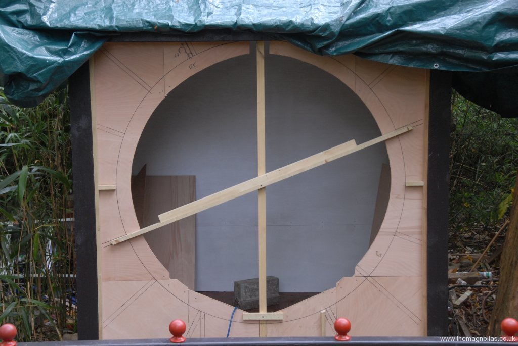 Having calculated a radius which used the wood for the best, we made a square of batten which fitted nicely inside the front timbers of the pagoda. Then using scrap ply made a temporary support for the decorative woodwork and the moon-gate to come. A vertical batten was fitted halfway across the front so that a central point could be found and used to draw a circle on the ply to represent the outside of the moon-gate. The decorative woodwork was fixed temporarily to the ply and screwed and glued to the outside square.