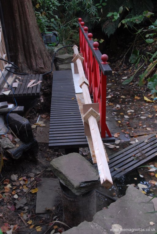 The next stage was to create a cantilevered step to bridge the gap between the pagoda and the planned walkway between the stepping stones. When this was in place the flooring of 2”x2” timber was laid with a gap between each for effect and drainage.