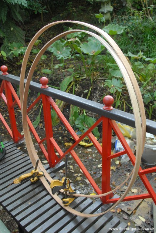 One of my earliest design ideas for the pagoda was to somehow build a moon-gate entrance to it. This was partly fuelled by having two 13ft long pieces of 3” by 1/4” meranti wood left from last year’s bridge project. I reasoned that these two cut longitudinally making four strips when glued together, would make timber in scale with the batten wood we had used on the bridge and the decorative woodwork of this project.
