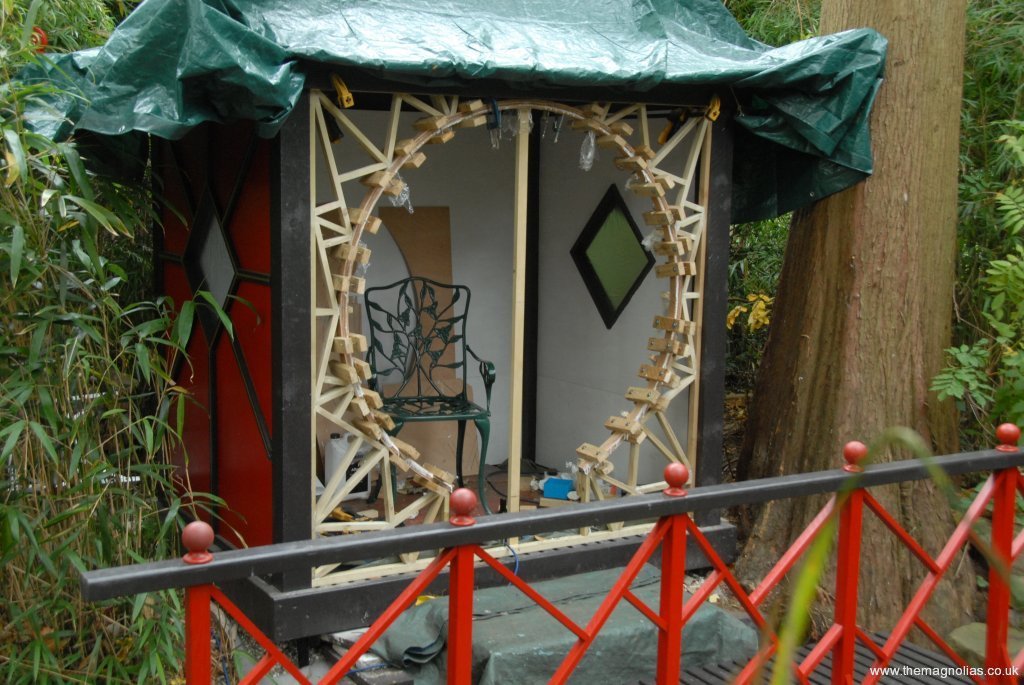When the glue had hardened, we took the square moon-gate decorative front out and prepared it for painting by sanding the wood and filling screw holes with plastic-wood filler and sanding them down. The front was transported up the garden and again painted in the front room. It received multiple coats of fire engine red followed by a ‘tough’ transparent coat. When dry we fixed it into the front of the pagoda with stainless steel screws.