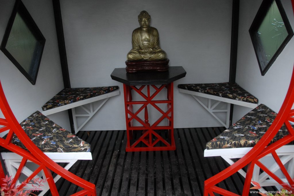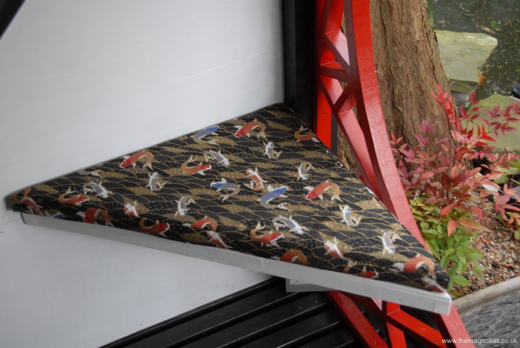 On inclement days while I have been writing blogs or working on the aquariums, Linda has been busy with her scissors, tape measure and sewing machine, making cushions for our four triangular pagoda seats. We searched for a considerable time on eBay for an oriental fabric suitable for upholstery, and the final choice was one depicting koi carp.