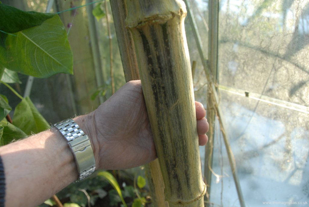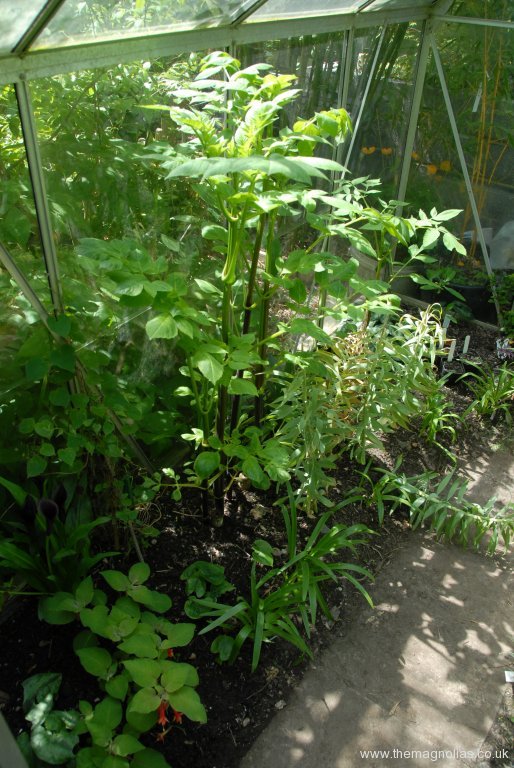 It grew rapidly in the spring, and the glass needed removing by the third week in May. It had been joined by the commoner pink form, bought at the Plant Heritage spring plant fair at Hyde Hall. I told the seller of our greenhouse idea, and he warned me it was likely to fail as the plant responds to day length and short of covering it with blackout material it would flower at the same time as without the greenhouse.
