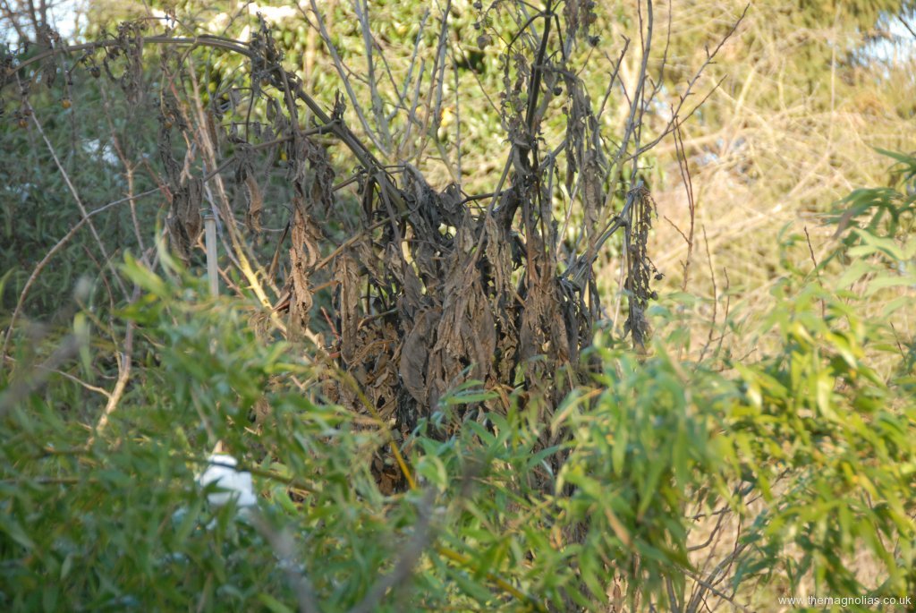 The buds were on the verge of opening when the current cold snap came. The result is total destruction of all foliage and flower buds. I have therefore cut it down to the ground and replaced the two panes of glass that had been removed in May.