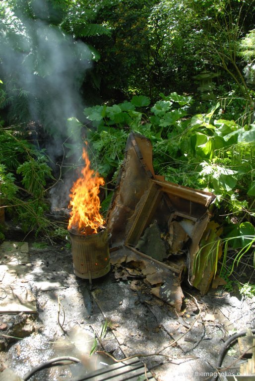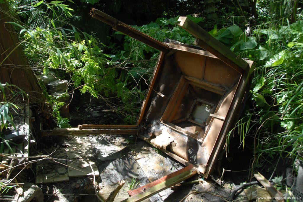 By the 6th June we were ready to do the demolition. As most of the construction was lightweight it wasn’t too big a job. For some while we had had it propped up with a post in case it toppled on to us while we did work in the pond, so minimum work with a chain saw had it rolling into the pond. We decided to burn the roof which was only hardboard covered in fish scale tiles cut out of roofing felt, in an incinerator. I cut it up with a large battery reciprocating saw into burnable sized pieces. All went well until we went a little way away for elevenses’, when the heat caught the rest of it on fire, so the job was speeded up somewhat and a bit of vegetation scorched.