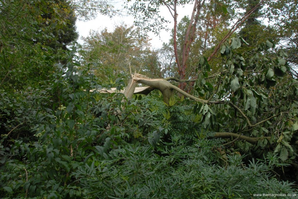 It was growing out of a stand of bamboo, Sasa palmata and the base of the trunk shattered with half of the bowl lifting and half remaining in the ground. It fell in an Easterly direction completely crossing over our right hand neighbours’ garden and going well into their right hand neighbours’ property.